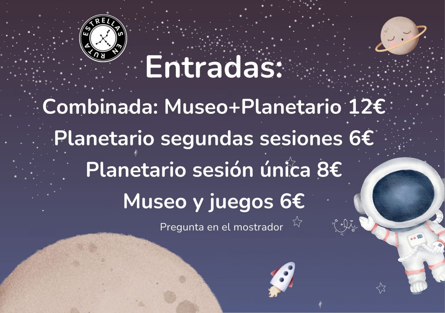 El precio de la entrada completa serían 12€; contar que como mínimo necesitaras 90 min para verlo todo, ya que en el planetario esteremos 45min y puedes entretenerte en los juegos y en el museo.